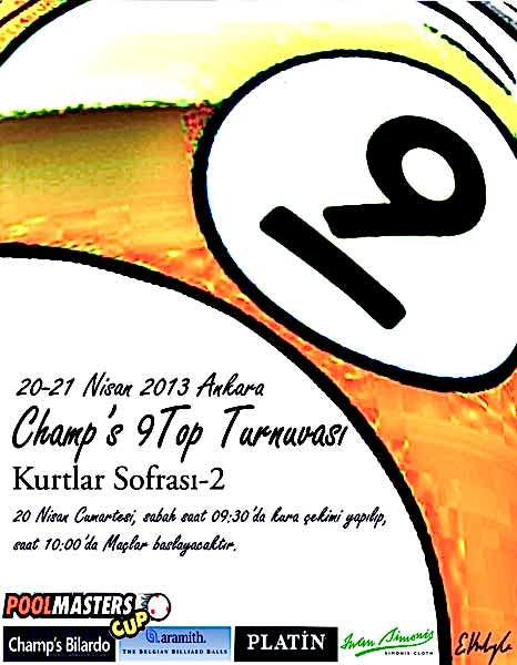 Champ’s 9 Top Kurtlar Sofrası bilardo turnuvası 20-21 Nisan 2013 tarihlerinde salonumuzda düzenlenecektir. Turnuvaya katılacak olan sporcuların başvurularını 0505 718 01 51 no’lu telefondan Raşit Saylam’a […]